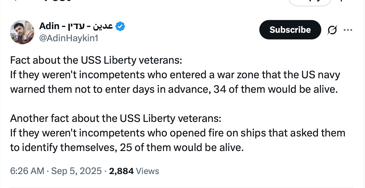 Below is a specimen, posted on Twitter on 5 September, of the best Israeli propaganda has to offer in 2025 regarding the Israeli attack on a US naval vessel that killed dozens of US servicemen. Decades of contrition to enable a cover-up has given way to gloating, mocking, and self-glorification, an opportunity to celebrate Israel superiority and impunity.